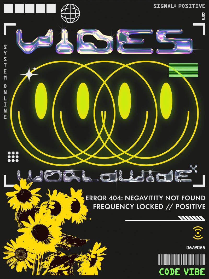 The Vibes Worldwide poster brings together bold streetwear style and Y2K-inspired art. Featuring chrome lettering, vibrant gradient effects, neon smileys, barcodes, and glitch details, it’s designed to capture the feeling of spreading good energy across the globe.
